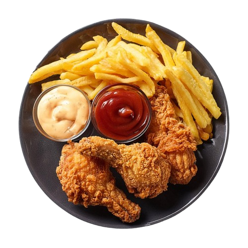 Plat de poulet assaisonné et cuit à la panure + frite de pomme de terre.