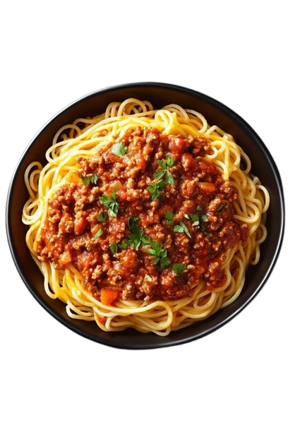 Plat de pâtes avec une sauce épicée à base de viande de boeuf et de tomate.