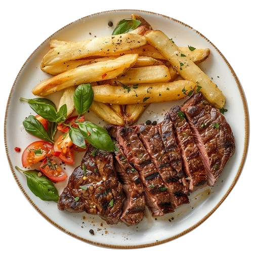 Filet de boeuf halal + bâtonnets de pomme de terre cuits par friture.